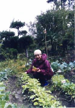 | ○写真3:我が家のちっちゃな家庭菜園。野良仕事姿のユウちゃん。自然の恵みをいただきま〜す。 |