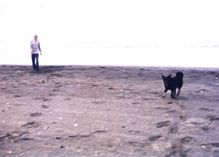 | ○写真4:サーファーを尻目に海岸で走り回るムックリとエーちゃん |