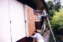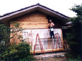 「♪贅沢しなくていいんだよ〜、自分で作ればオリジナル〜♪」ということで、「できることはなるべく自分達でやろう」と、リフォームした古家の外壁を自分達で塗ることにした。平家なので足場を組む必要もないので、これなら素人でもできるはず。外壁は、比較的安価な節有りの杉材を使い、「下見板」というちょいと古い日本家屋の工法を用いている。