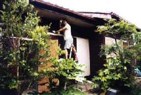 | ○写真1:「かきべん」を塗る筆者。高い所は僕にお任せ! 地下足袋が気持ちイイのだ。 |