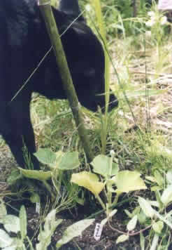 その3週間ほど前から肥料と石灰を入れて準備しておいた予定地に苗を植えました(写真4 : 苗をチェックするムックリ)。
