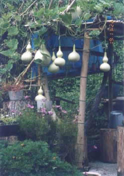 写真の通り今年も立派なひょうたんができました。え、なんか感じが違う? はい、実はこれはご近所の石崎さんのお宅のひょうたんです。我が家のひょうたんは肥料不足のためか、あまり上手く育たなかったのです(ショボボボボーン)。まあ、苗はウチから差し上げたものなので‥‥(お礼にいくつかいただいちゃいました)。ジャンボだるまヒョウタンや中国ヒョウタン、首の短いツルクビ・ヒョウタンなど、いろんな形のひょうたんがブ〜ラブラ。