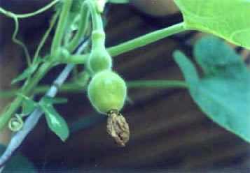 少し前まではあんなに小っちゃい実(写真2)だったのに。みなさんのひょうたんはいかがでしたか? ちゃんと順調に育ちましたでしょうか?まだ青いひょうたんですが、置いておけばだんだんと色も抜け、同時に水分も抜けていって堅い殻のひょうたんに変身していきます。水に浸けて中をくり抜いてという方法もあるのですが、自然乾燥ならそのままで大丈夫。少し時間はかかりますが、しばしその移り行きを楽しみながら気長に待ちましょう。