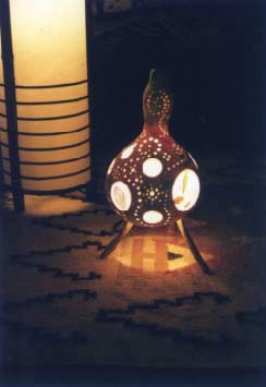 ひょうたんができたら、楽器を作るのもいいけど、ひょうたんの照明なぞもいいかと。試しに作ってみました。名付けて「ひょうたん灯」(そのまんまかよ)。皆さんもお一ついかが。(え)