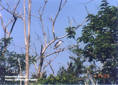 | ○写真6:ゴイサギ : シラサギ類とはちょっと違って首が短くズングリしている。 |