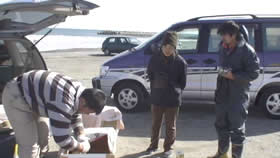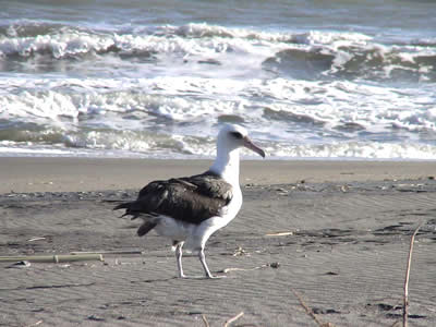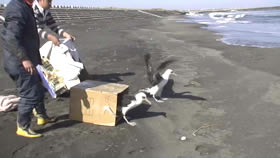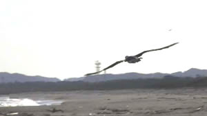 まずは最後の食事(お魚)を与え、2羽を波打ち際に運ぶ。箱から出された2羽は、「ここは何処?」と見慣れぬ景色に少し当惑したのか「カタカタカタカタ」とくちばしを叩き合わせた。が、しばらくすると陸から海に向かって吹く風に何度も羽ばたきをはじめました。おお、これはいけるかもしれない、と思っていると1羽(♂)が風に向かって走り出した。「飛んだ!!」っと歓声をあげたのもつかの間。1〜2m位の高さで20mほど飛んだものの失速し砂浜にすぐに降りてしまったのです。その後も何度かトライしたがそれ以上飛ぶことはありませんでした。