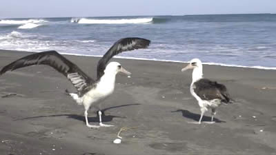 「コアホウドリ」というけれど、実際はかなりでかい。羽を広げると2m近くあり、北半球で繁殖する最大の海洋鳥「アホウドリ」よりひとまわり小さいだけだ。ハワイ諸島のミッドウェイ島やレイサン島を集団繁殖地にしていて、国内では小笠原諸島の鳥島が唯一の繁殖地となっているらしい。繁殖後は北大平洋亜寒帯水域へ移動し、洋上で生活する。好物はイカ。繁殖地以外ではほとんど鳴かないらしい。