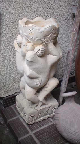 お次は、玄関脇のこれまたカエルの石像くん。驚くほど柔らかい石?を彫ってあるので雨に濡れると溶けてしまう。上の部分が花の鉢受けになっているのですが、水やりしにくいのでそのまま空っぽだ。(写真2)