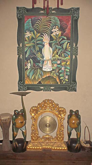 玄関を入ると正面に大きなバリ絵画のオウムの絵。その下にバリのガムランで使う小型で高音のゴングの一種「クレントン」があり、その両隣りに結構大きい木彫りのカエルくんたち。手に葉っぱの傘を持っています(右のカエルくんも最初は持っていたのですが、よく引っ掛けて落としてしまうので、取ってあります)。(写真3)