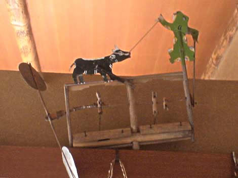 スズメ追いの「ピンジャカン」の上部の飾りにもカエルくんが(写真6)。ピンジャカンは、横に付いたプロペラが風を受け、軸を廻して竹の鍵盤を叩き、音を鳴らすようにできています。さらに上のカエルと牛さんが動く仕掛けにもなっていてカワイイ。(庭の竹棹に刺しておいたら壊れてしまって、今は家の中に)