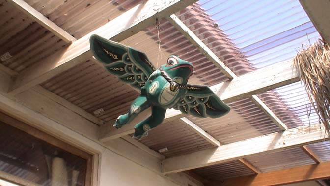 そしてテラスの屋根には羽の生えたカエルくん(写真7)。風を受けてユラユラと気持ち良さそうに飛んでいます。実はトイレの天上にも小さなカエルが飛んでいるのですが…こちらはその時のお楽しみに。