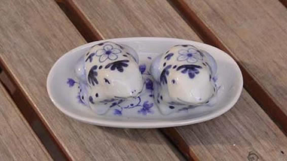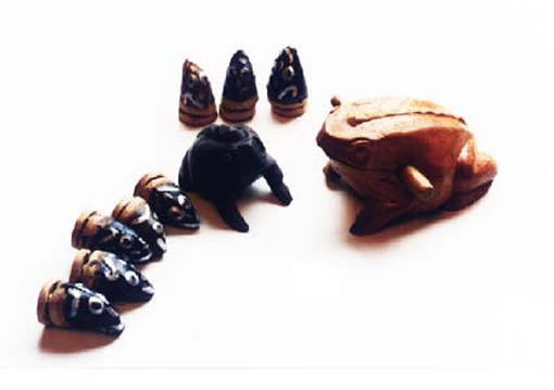 所変わってベトナムはバッチャン焼きの塩コショウ入れ(写真8)。ベトナムもカエルものは多いようで、木彫りのカエルは、棒で背中のギザギザを擦るとほんとにカエルのような鳴き声がします(写真9)。