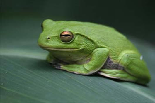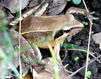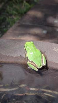 そんなわけで、我が家はカエルだらけ、という様相を呈しています。それに、ほんもののカエルくんたちもいるのです。下手な天気予報よりも適中率の高いアマガエルくん(写真11)。逃げも隠れもせず、無防備によく昼寝をしているシュレーゲルアオガエルくん(写真12)。たぶんニホンアカガエルくん(写真13)と思われる茶色いヤツ。みんな多分、我が家の守神なのでしょう。これからもよろしく我が家を守ってケロケロ。 (え)