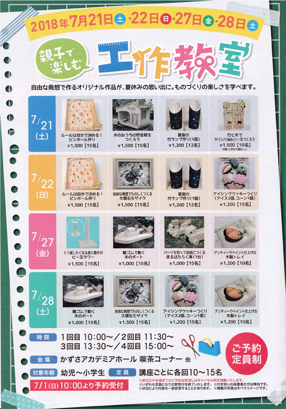 *工作教室はこの他、「大理石モザイクアート体験」や「輪ゴムで作る木のボート」など色々なプログラムがあります。