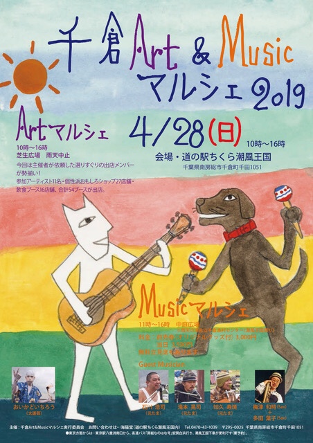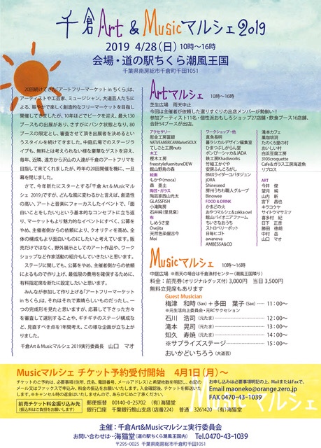 ■4/28(日) 『千倉Art & Music マルシェ2019』(千葉県/道の駅ちくら潮風王国)![]() *10:00~16:00 入場無料 雨天中止 *会場:道の駅ちくら潮風王国*千倉在住のイラストレーター・山口マオさんが主催し、昨年20回で幕を閉じたアートフリーマーケットですが、よりアートと音楽にフォーカスし、主催者から依頼したアーティスト、作り手、飲食による54ブースがクオリティの高い賑わいを魅せる『千倉Art & Music マルシェ2019』として再スタート。勝田徳郎、日下正彦、中村岳、各氏による野外展示もあります。 *ポンぴ〜シャカも今年も楽器作りのWSと手作り自然楽器の実演販売で出店させていただきます。みんなで地球の回る音を奏でよう!お待ちしていま〜す。 ▼チラシはクリックで拡大できます。 *Musicマルシェは、プロのアーティストのみで構成。 出演:大道芸人おいかどいちろう、梅津和時さん、多田葉子(sax)、石川浩司さん、滝本晃司さん、知久寿焼さんのソロと3人揃った「しょぼたま」ライブもアリ。 ※今回、ライブは、有料指定席を設けます。前売り券 3000円(記念グッズ付き)、当日券 3500円 4月1日10時より下記のFAX か メールのみで受付開始です。 FAX 0470-43-1039 Email maoneko@orange.zero.jp *その他、詳細はhttps://uminekodo.exblog.jp/ ▼写真は2018年の様子。