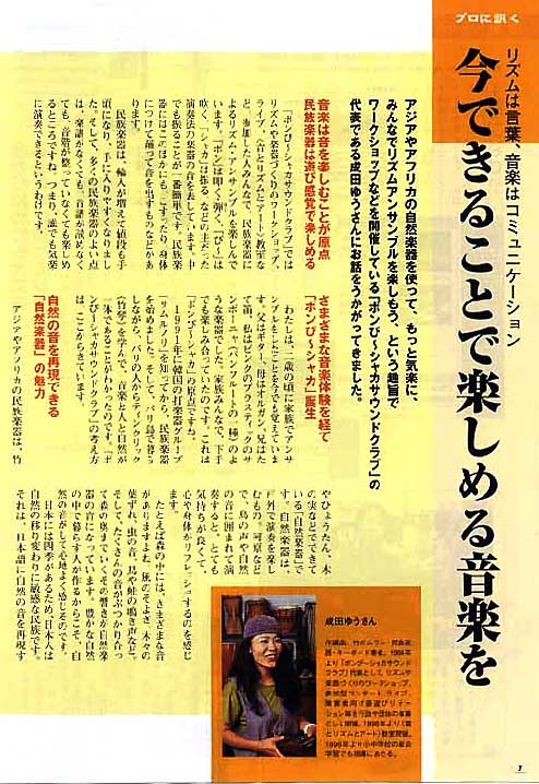 ●ポンぴ〜シャカが明治生命のPR誌『L&L』2000年9月号に掲載されました!! ポンぴ〜の教室の様子と楽器たちが『L&L』の表紙と目次見開きグラビア、ポンぴ〜を中心とした楽器紹介(ディジュも載ってるよ)、そして主宰の鈴木(成田)ゆうの見開きインタヴューとほとんどポンぴ〜色でまるごと掲載されています。