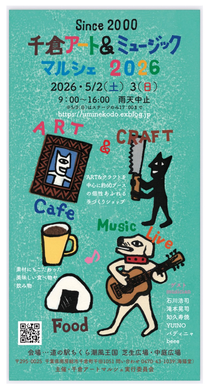 ■2026年5月2日(土)『ちくらArt & Music マルシェ』出店します!*10:00〜16:00 入場無料(5月2日・3日両日開催 ポンぴ〜は2日のみ) *会場:千葉県・道の駅ちくら潮風王国 *千倉在住のイラストレーター山口マオさんが主催し、2018年20回で幕を閉じたアートフリーマーケットですが、よりアートと音楽にフォーカスし、主催者から依頼したアーティスト、作り手、飲食によるブースがクオリティの高い賑わいを魅せる『千倉Art & Music マルシェ』として再スタート。 *JADA&ポンぴ〜シャカも今年も楽器作りのWSと手作り自然楽器の実演販売で出店させていただきます。みんなで地球の回る音を奏でよう!お待ちしていま〜す。 *Musicマルシェは、プロのアーティストのみで構成。 *その他、詳細はhttps://uminekodo.exblog.jp/
