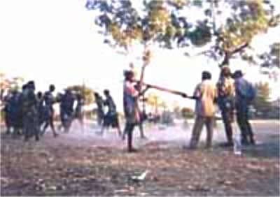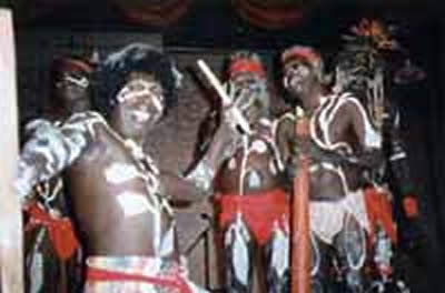夕暮れの迫るコミュニティのはずれのグランドで14〜15歳くらいの男の子達がディジュとソングに合わせ、砂塵を巻き上げながら踊っている。 NBAのランニングを着た今ドキの男の子達の何人かは部分的な簡易ボディ・ペインティングをしている。ソングマンとディジュはホワイト・コッカトゥーのメンバーだ。